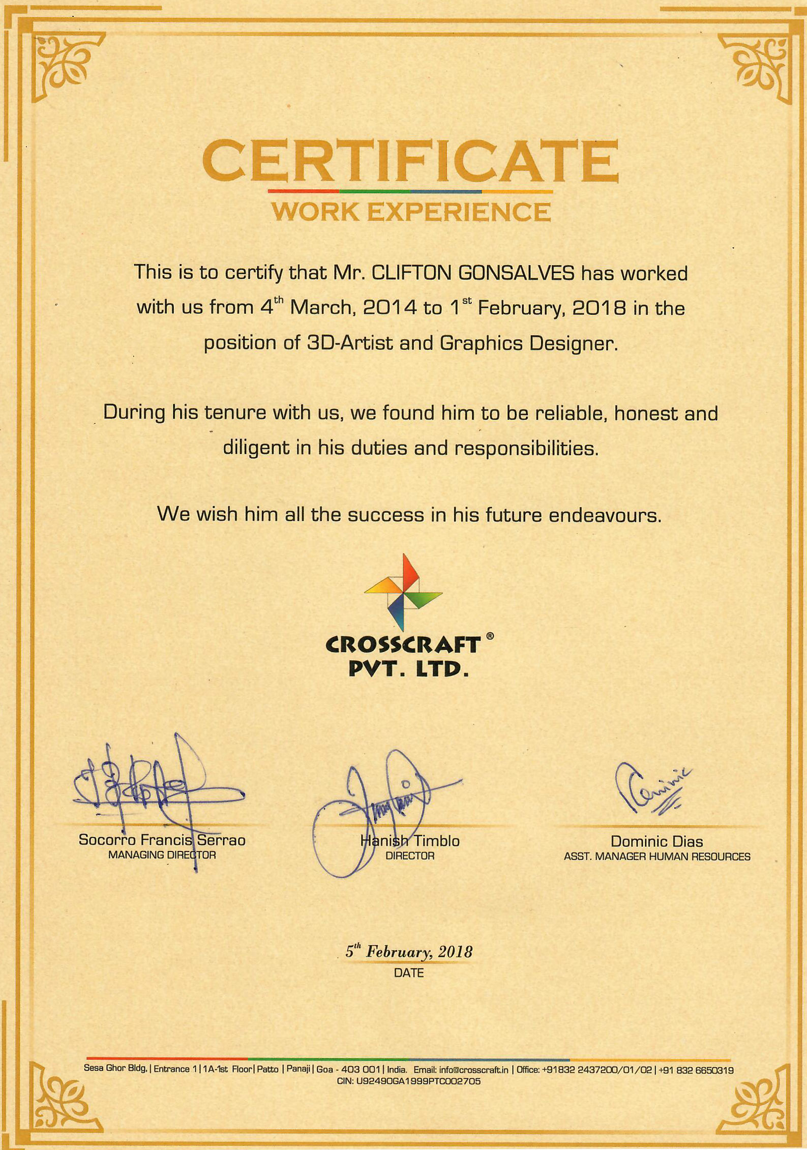 Crosscraft Pvt. Ltd.- Goa, INDIA(www.crosscraft.in) – March 2014 – 1 February 2018